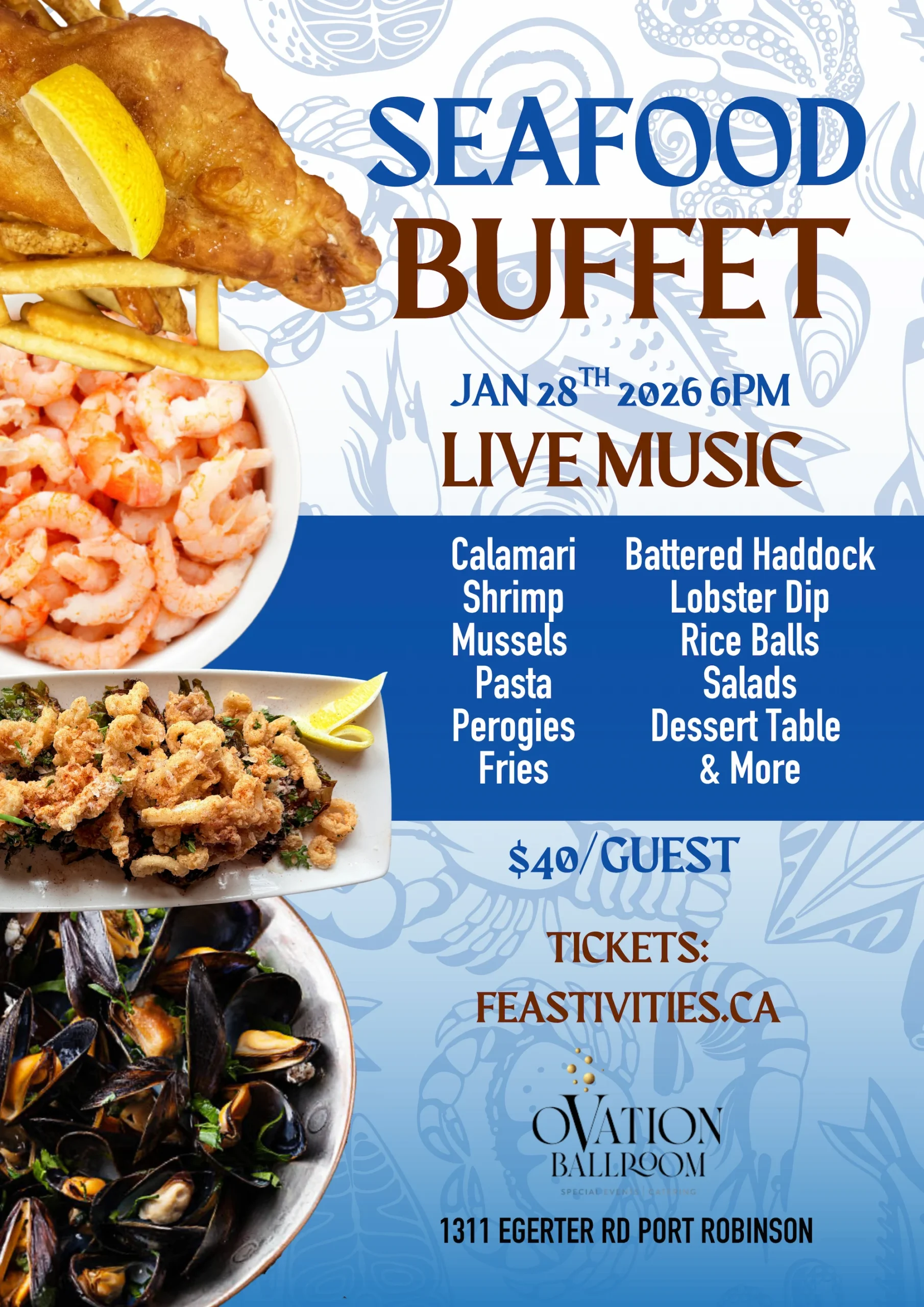 Dive into a delicious evening at our Seafood Buffet Event – featuring all your favourites like Calamari, Shrimp, Mussels, Pasta, Perogies, Fries, Battered Haddock, Lobster Dip, Rice Balls, Salads, a Dessert Table & more! Enjoy live music while you feast, and sip your favourite drink from our cash bar. It’s the perfect night out for seafood lovers and great company!